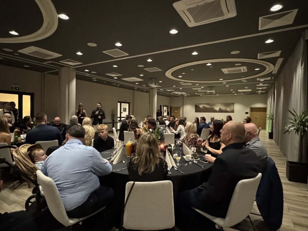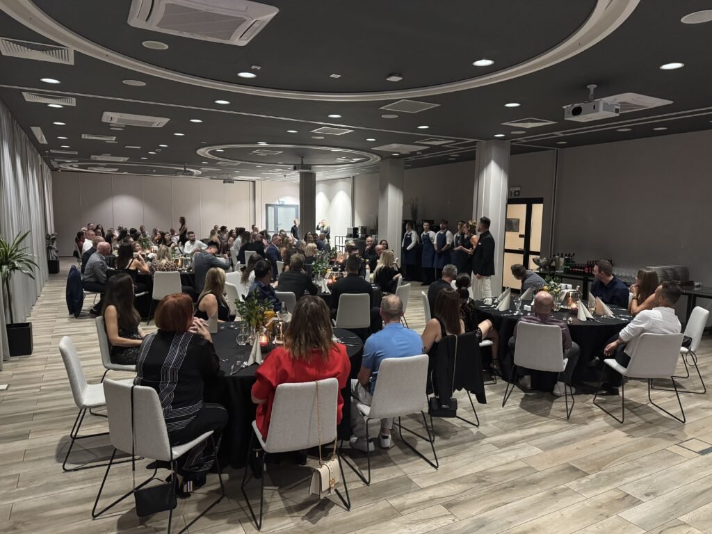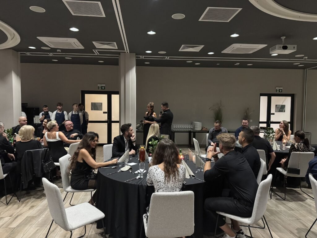 Wieczorem spotkaliśmy się na uroczystej kolacji, która stanowiła kulminacyjny punkt dnia. Przy pięknie przygotowanych stołach mogliśmy delektować się wyśmienitymi potrawami i spędzić czas w wyjątkowej, eleganckiej oprawie. To był moment, by wspólnie usiąść, porozmawiać i nacieszyć się atmosferą spotkania w gronie całego zespołu.